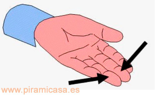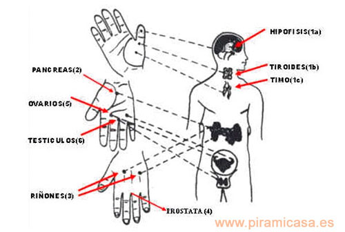 La hipófisis (1a) se localiza en el centro del pulpejo del pulgar, en la mano derecha para la mujer y en la izquierda para el hombre.
