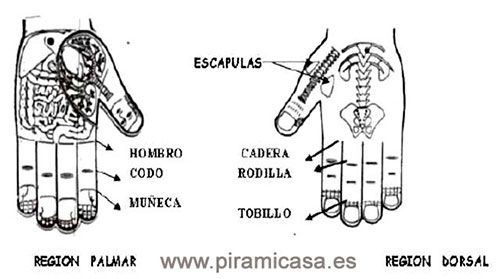 MINISISTEMA ANALÓGICO DEL PULGAR INVERTIDO: Sabemos, por la imagen representativa de los órganos en la palma de la mano (ver imagen), que la cara y cabeza se encuentran ubicados en el pulpejo de ambos pulgares. No obstante, existe un interesante y efectivo método que localiza estas zonas en el dorso del pulgar, visto de forma invertida: