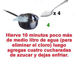 - 4) Debes calentar agua potable, pero si contiene cloro, es preferible hervirla unos diez minutos. El cloro inhibe la proliferación de las levaduras que debes usar luego. Cuando haya largado el hervor, la dejas a fuego mínimo unos diez minutos, mientras agregas cuatro cucharadas de azúcar y revuelves un par de veces. Ya la has hervido y te quedará algo más de medio litro de agua azucarada. Dejas que se enfríe.
