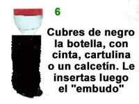 - 6) Mientras dejas que se enfríe bien el agua para poder echar la levadura, tienes tiempo a preparar la botella. La cubres como se indica en la imagen, con una cartulina negra, plástico, un calcetín o lo que tengas. Luego insertas la parte de arriba (el embudo), sin tapa y con el pico hacia abajo. Lo aseguras bien con la cinta o el calcetín y ya la tienes lista.