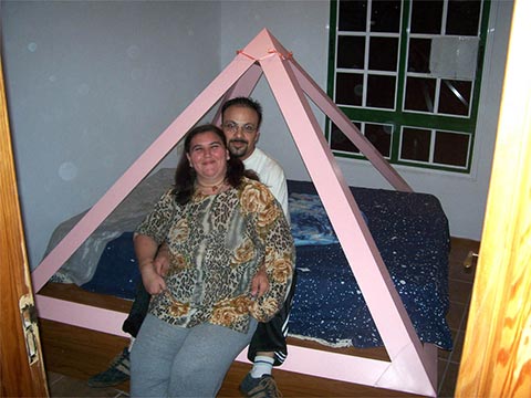 3 mm dicke Pyramide mit 100 mm Flügeln, im perfekten Winkel (es sind nicht einfach nur zusammengesetzte Rohre). Die Maße sind abhängig vom Raum und der Körpergröße der Benutzer. Alle unsere Pyramiden umfassen vier orgoniten von perfekter Qualität.