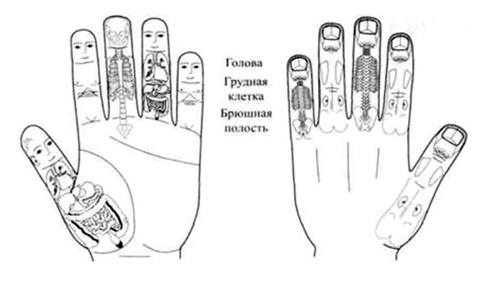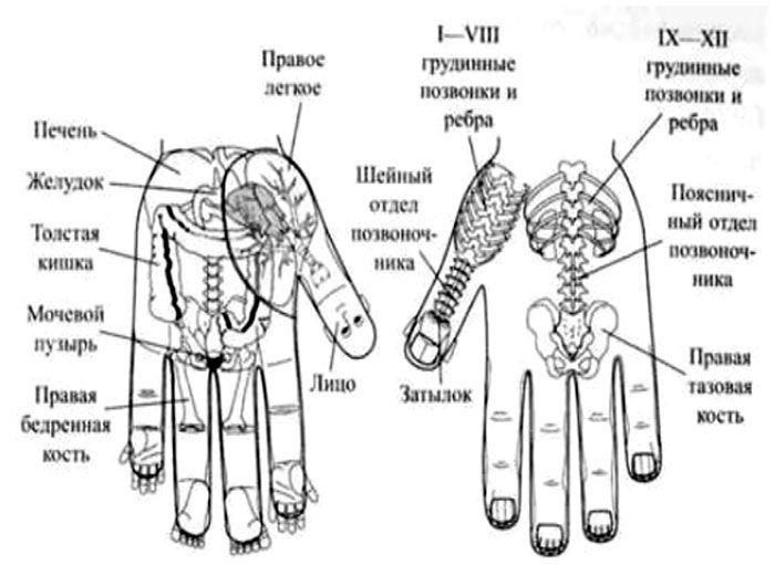 Los órganos del abdomen se representan a todo lo largo y ancho de la región palmar como puede observarse en la lámina de abajo.