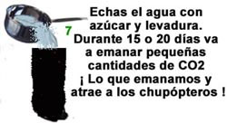 - 7) Le echas el agua con azúcar y levadura y tendrás en unos minutos un atractivo formidable para los bichos picadores, que entran pero no podrán salir de la trampa, a menos que no hayan caído al agua y logren embocar con la salida. Pero lo que atrae a los insectos es el CO2 y otros gases que desprenden en pequeñísimas (pero suficientes) cantidades las levaduras. O sea los mismos gases y olores que emanamos por nuestra piel. Ellos no pueden resistirse... Y se dan el último baño, el baño mortal.