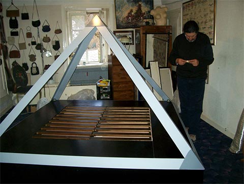 3 mm dicke Pyramide mit 100 mm Flügeln, im perfekten Winkel (es sind nicht einfach nur zusammengesetzte Rohre). Die Maße sind abhängig vom Raum und der Körpergröße der Benutzer. Alle unsere Pyramiden umfassen vier orgoniten von perfekter Qualität.