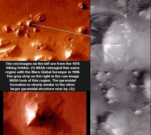 Als ob sie auf der Erde nicht genug wären, haben wir sie auf dem Mars und dem Mond gesehen, obwohl die NASA jetzt sagt, dass es sich um Montagen, Illusionen, Spiele aus Licht und Schatten handelt ... um die Gründe dafür zu vertuschen, warum die Herren der Welt Krieg führen, anstatt den Weltraum zu erforschen? Ich glaube, wir dürfen die Pyramiden nicht besichtigen. Ganz einfach: (Vorerst) begnügen wir uns mit den Fotos vom Mars und dem Mond, auf denen die Pyramiden zweifellos künstlich sind, da kein Erosionsprozess diese Formen erzeugen kann. Durch Winderosion (die wichtigste Erosion auf dem Mars) werden Körper in jedem Winkel abgerundet und zu Hügeln geformt.